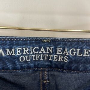 Women’s blue dark wash denim American Eagle Retro Low Rise Straight Stretch Jeans.