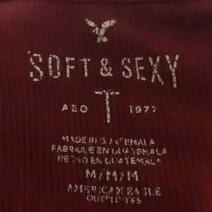 Maroon ribbed short sleeved top with a few buttons down the front. Top is darker than the photos show, and looks more like the last photo