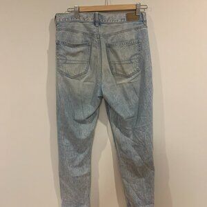 Light wash very distressed mom jeans from American Eagle. High rise relaxed fit. Used condition.