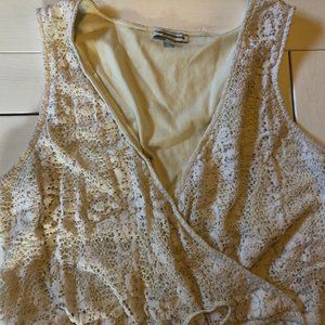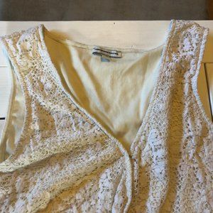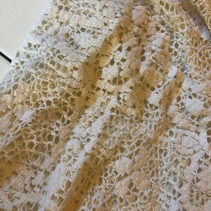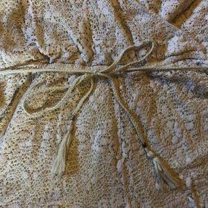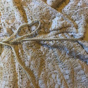 Lace/crochet cream coloured romper in excellent condition (aside from a few pulled thread shown in photos). Tie at the waist and hook for adjustable v-neck.