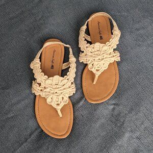 Pre-loved American Eagle macrame thong sandals, great for casual or semi-formal occasions. The ankle strap has some elastic stretch so they are easy to put on. There are small scuffs on the toe of each sandal, but they are otherwise clean and in good condition.
