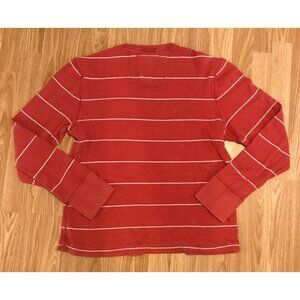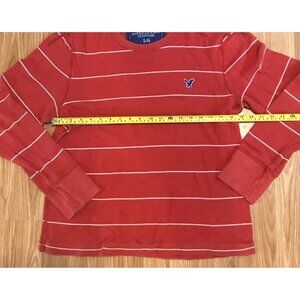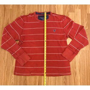 This American Eagle Outfitters shirt features a classic vintage fit with orange or terracotta and white stripes. Waffle knit pull over . Ideal for both casual and semi-formal settings.