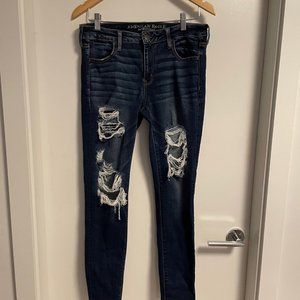 Distressed bottom and rips in the front. Stretchy, very comfortable.