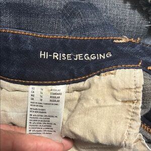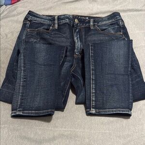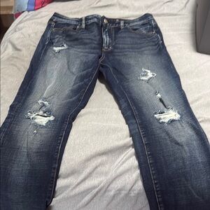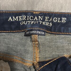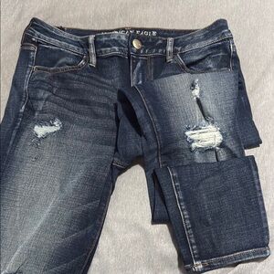 These American Eagle Outfitters skinny jeans feature a classic blue wash with intentional distressing for a modern, worn-in look. The denim's gradient effect from dark to light blue adds depth and character, making them a versatile choice for casual outings.