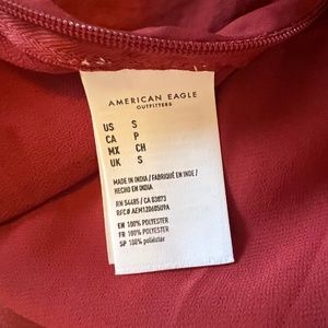 American Eagle midi-length red skirt. Size small. Excellent condition-never worn out. Soft rust-red colour. polyester. lined. Easy to dress up and down. Elastic sewn around inside of waist with a side zipper and hook closure. Approximately 14" across waist and 28" long.