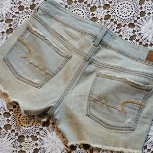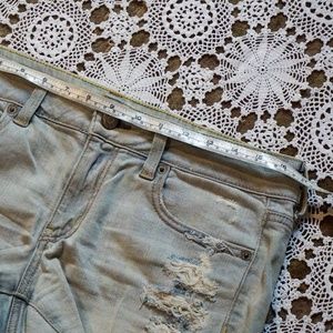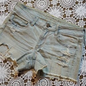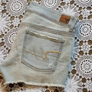 Midi-rise jean shorts from American Eagle! Naturally disressed, with no extra stains or discolouration. The threading from the right thigh hole tore open, but the hole size remained the same size.