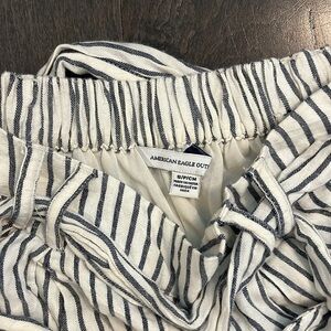 American Eagle lightweight wide leg pants in a navy and white vertical stripe. Features a high-rise elastic waistband with a removable tie belt. Size small. Soft, breathable fabric. In great condition with some natural wrinkling.