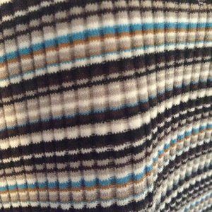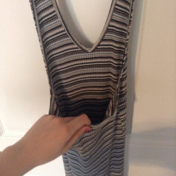 This is a cute, ribbed, striped mini summer dress from American Eagle. It doesn't fit me right, and I've never worn it. It is very stretchy and soft, but not see through. It has a deep V-neck and half open back. Very cute dress :)