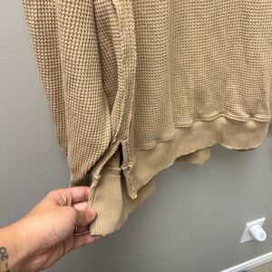 Cozy and stylish American Eagle oversized waffle-knit crewneck in a warm tan shade. Features soft, breathable fabric and a relaxed fit — perfect for layering or wearing alone for casual, everyday comfort. Ideal for lounging, running errands, or pairing with jeans or leggings.