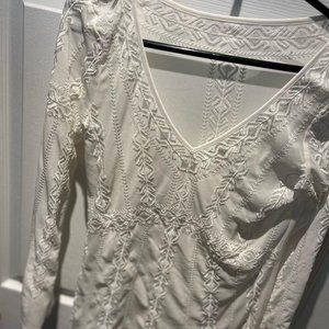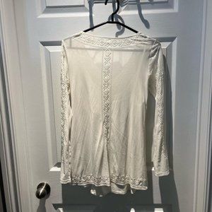 American Eagle white long shirt with intricate lace detailing throughout. The outer layer is sheer, but the product comes with a white under layer shirt (as seen in the picture). Both shirts are in great condition!