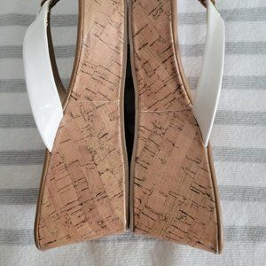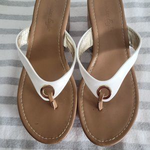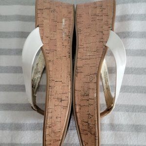 American Eagle, Size 9 1/2, white patent, thong style, platform wedges. Some white marks on the wedge per pics. Sole reflects use, otherwise great condition.