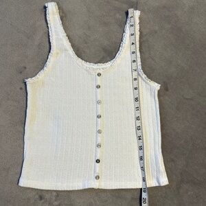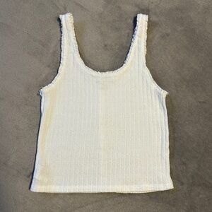 AE Tank Top, white, ribbed, crochet lace ruffle trim.