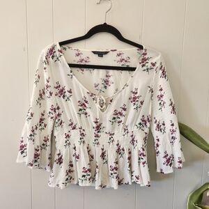 American Eagle White Smocked Floral Cottagecore White Top Bell 3/4 Sleeves Boho
