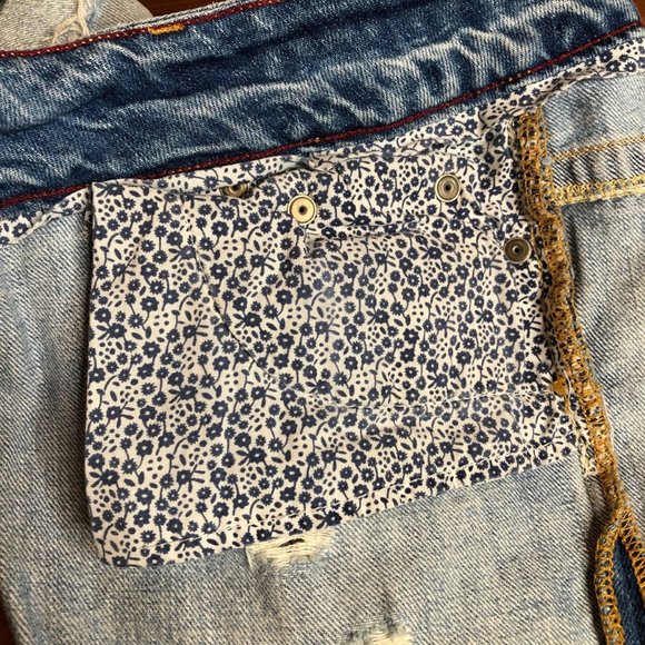 Worn in, faded look with intentional distressing and fraying.