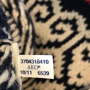 American Eagle Outfitters sweater, women's size Small in Navy natural wool beige and orange/reddish accent trim. Sweater has crochet crew neck and jaquard pattern with ribbed waist hem and wrist cuffs in a wool blend. AEO style "Light Stone Heather", manufactored in 2011 has retro, country/farmgirl, fisherman, coastal, nautical and classic styling, is cozy and warm.