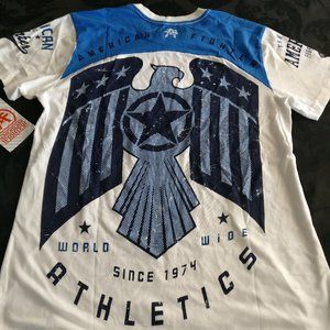 Bold American Fighter tee with striking blue graphics on white. Features athletic division design. Ideal for casual style.