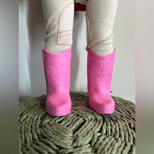 Pink equestrian jacket star elbow patch, tan pants and pink cow girl boots