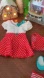 In excellent used condition, this American Girl Kit's Beforever Reporter Dress outfit includes red and white 1930s-style dress featuring polka dot skirt, white bodice and turqouise attached collar, matching polka dot vest, white tights and turqoise ballet flat shoes. Also included with this set is off-brand red vintage style handbag with gold link strap.