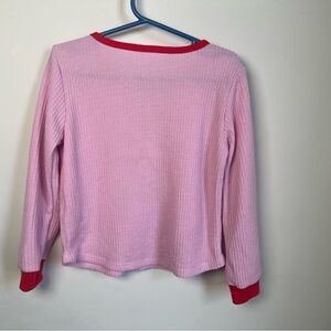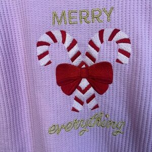 Adorable American Girl pyjama top. Ribbed style material - could honestly wear this as a regular everyday top because of the design and look. Embroidered festive holiday Christmas "Merry Everything design with candy canes. Pink and red vibrant colours.