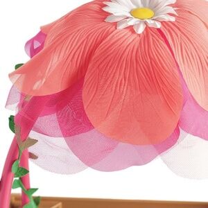 features include: a pretty chiffon petal canopy with a silk Daisy on top, whimsical fabric vines that wind around the frame, a crate to sit in, an attached boot rack - perfect for a pair of wellies and stylized wheels that really roll!