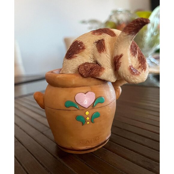 American Greeting Cards Pet Tales AGC 'Treasure Hunt' 3.5” Tall Cat Figurine. It depicts a cat looking into a bowl or pot. Very cute and a must-have for any cat lover's collection.