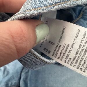 These blue jean shorts from American Eagle Outfitters feature a relaxed fit with a stylish distressed design. The frayed hems and light blue wash give them a trendy, worn-in look perfect for casual summer outings. Enjoy the comfort and effortless style of these must-have jean shorts.