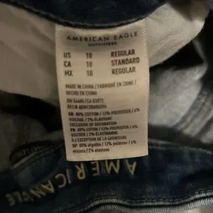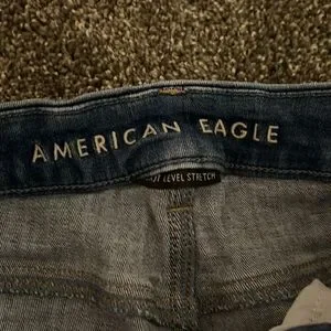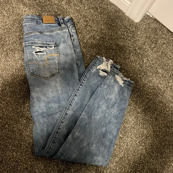 Hardly worn blue ripped jeans from American Eagle. They are in perfect condition, and the rips are still together. It is a size 10 standard.