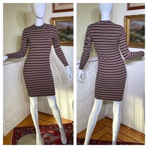 In excellent preowned condition flattering body hugging long sleeve mock turtleneck striped mini dress. Size Large, fits like a size 6.