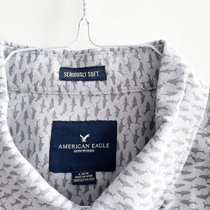 American Eagle Mens Button Down Shirt Seriously Soft Shark Print Gray Large