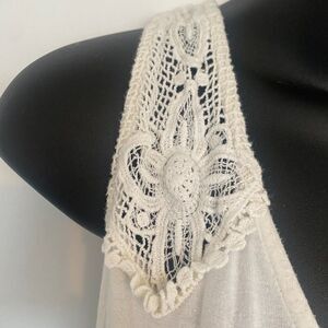 Cropped wrap top with crochet tie-back lace detail and back tie. Style with a lace bralette for a breezy, summery look! Size S.