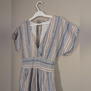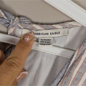 Casual and cute American Eagle romper, perfect for warm weather and easy styling. Made from breathable cotton with vertical stripes in soft blue, white, and blush tones. Features a deep V-neckline, adjustable tie-back detail, and a relaxed fit through the shorts.