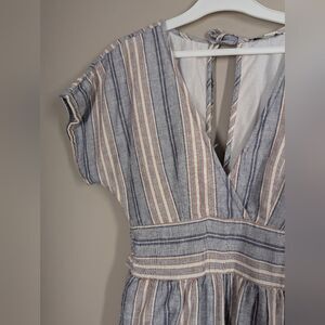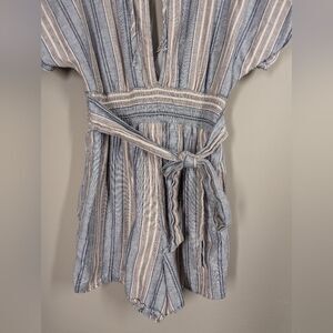 Casual and cute American Eagle romper, perfect for warm weather and easy styling. Made from breathable cotton with vertical stripes in soft blue, white, and blush tones. Features a deep V-neckline, adjustable tie-back detail, and a relaxed fit through the shorts.