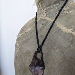 This necklace features a raw Amethyst crystal set in a unique electroformed pendant featuring all sorts of interesting textures. This unique pendant comes on a braided cotton cord and nylon cord necklace and can be tied to be worn longer or shorter.