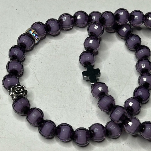 Purple crystal beads with cross charm. Encourages peace, balance, and spiritual clarity.