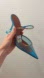 Bright blue PVC with rainbow crystal straps, a sleek pointed toe, and the brand’s signature flared heel.