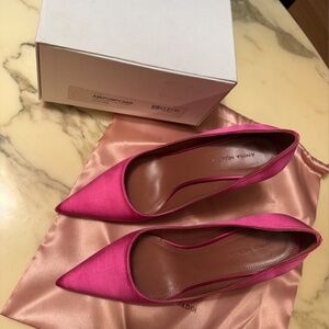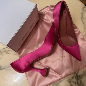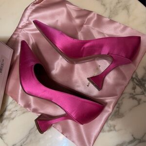 Amina Muaddi Ami Pointed-Toe Pumps in Pink Satin: Women's size EU 39 / typical conversion is US 8.5/9 - good condition, satin material so there are some scratches and wear but nothing major, see images for full view and condition, all angles are displayed. Colour is beautiful - magenta pink. Heel height on this model is H3.75". Paid CAD $790 plus taxes.