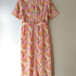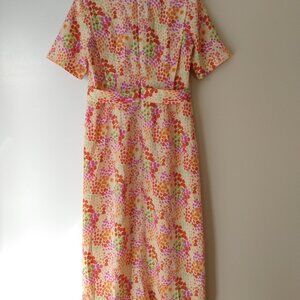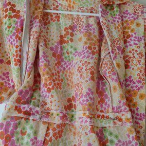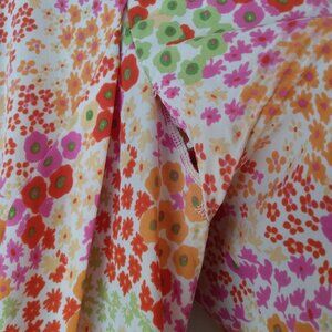 The fabric is non-stretch and features a bright floral print. Lightweight.