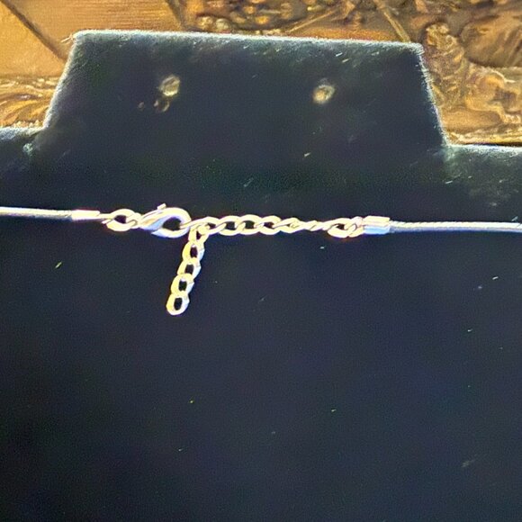 Necklace is thin black leather with silver tone lobster claw clasp.
