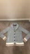 Marbled light grey Amnesia knit button up sweater with cream and red trim.