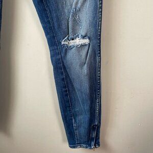 medium wash, distressed mid-rise skinny jeans with five pockets, tonal stitching throughout, zip closure at sides and zip closure at front.