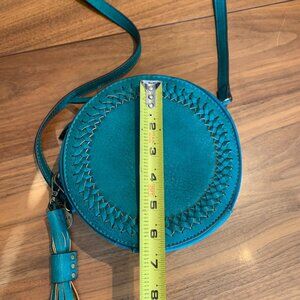 Ampere mini cross body purse, bag, satchel in interesting turquoise colour. Long shoulder strap has some adjustment available. Charming round shape with zippered entry, rigid sides, tassel, braid detail and will hold iphone. Interior fully lined with zippered compartment. Vegan leather in excellent used condition with no damage detected. Some smudges on bottom, so minor they do not show in photo, assumed to be the leather finish. Hands free use for everyday, date night, weekend market visits. Style it your way with additional pieces from Our closet (some suggestions shown all listed and priced separately), make a bundle to save a bundle. So cute, so now, so you, from Lemon squeezy Shop🍋