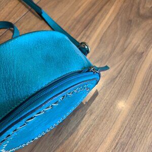 Ampere purse, cross body, mini, holds iphone, round, vegan leather, turquoise