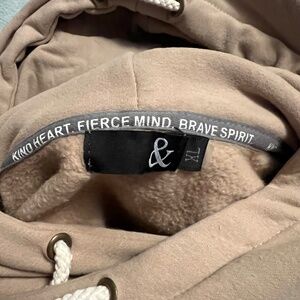 In excellent condition. Heavier weight. Drawstring hood & side pockets. Taupe, beige, grey.