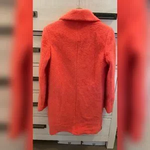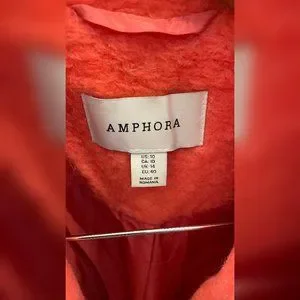 Gorgeous bright coral coat by Amphora. Nice and warm fabric: 46% polyester, 32% acrylic, 22% wool; lining 100% polyester. Made in Romania.