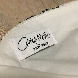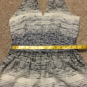 Very good preowned condition, designer halter dress by Amy Matto New York. Made of a beautiful fabric in dark navy blue (almost black) and white dithered stripes with some silver threaded into it. Not sure what to call it, reminds me of old linen. Has a 70s feel with a modern flair. It's gorgeous.