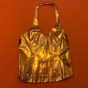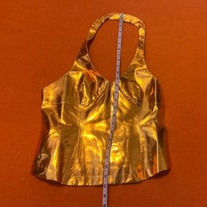 Amylynn metallic orange halter cami new with tags. Plunging neckline, vinyl with jersey lining, hidden zip closure at the back, faux leather like, fully lined. This top is gorgeous in person, pictures don’t do it justice. Very shiny and great luxurious quality. Perfect for your summer 80s disco retro themed parties! Composition: 60% polyurethane, 30% polyester, 10% cotton. Marked size L, please see pictures for measurements. This item comes from a smoke free, pets friendly home. Recycled bags/box used when possible. Thanks for watching!