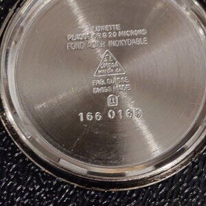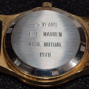 Case: Gold-plated stainless steel (20 microns) 36mm (not including the crown). The watch back is engraved, "25 Years EL Warren Mich. Mutual 1978".