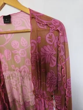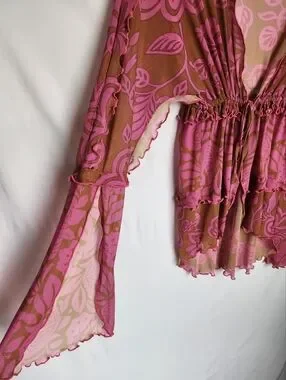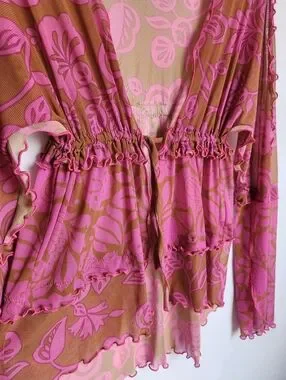 Ana Sui, pink and tan, floral, mesh, open top, with drawstring waist, layered, lettuce trim ruffles, size small, excellent condition.