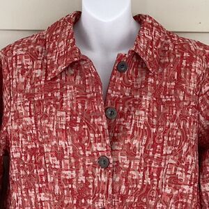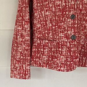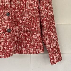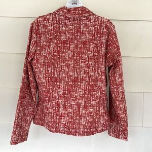 Coral/ terra cotta print, button front, cotton, polyester, spandex, collar, unlined, two front pockets, EUC, neck to hem 23”, armpit to armpit across back 20”, armpit to cuff 17”