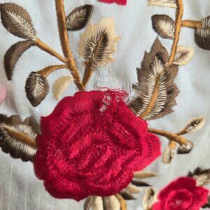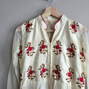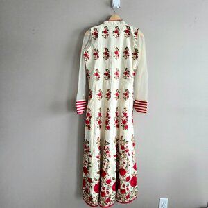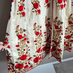 Anarkali suit with red floral embroidery. East Indian outfit.